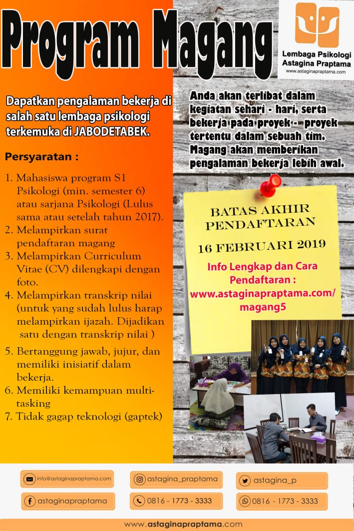 Mencari pengalaman kerja nyata? Pengalaman magang yang kami tawarkan memberikan peluang luas untuk meraih pengalaman praktek kerja nyata. Anda akan melakukan tugas menantang dalam situasi bisnis yang nyata. Kami memberi kesempatan bagi seluruh mahasiswa maupun yang sudah lulus. Magang akan berlangsung selama 5 bulan di PT Astagina Praptama Aksaya yang terletak di alamat Griya Timur Indah Blok A3 No.28, Jatimulya, Tambun Selatan, Kab. Bekasi, Jawa Barat 17510.